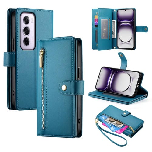 Funda de Cuero para Teléfono con Nueve Ranuras para Tarjetas y Cremallera para Oppo Reno12 Pro Global (Azul)