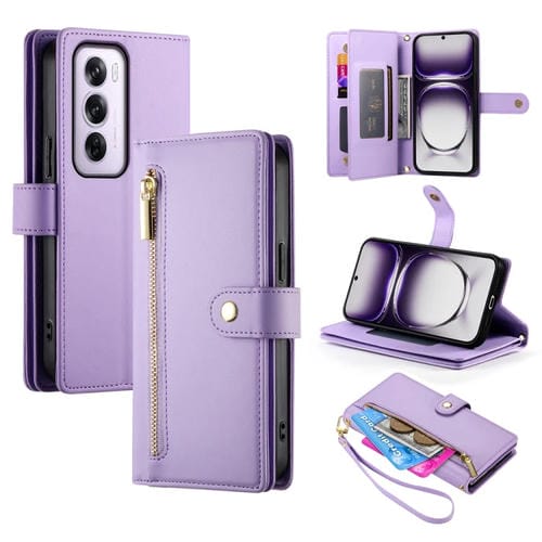 Funda de Cuero para Teléfono con Nueve Ranuras para Tarjetas y Cremallera para Oppo Reno12 Pro Global (Morado)