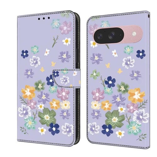 Funda de Cuero Pintada a Mano para Google Pixel 9 y 9 Pro (Floral Morado)