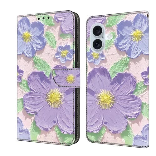 Funda de Cuero para iPhone 16 Pintada al Óleo con Flores Moradas