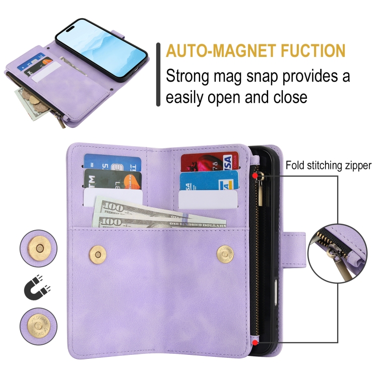 Funda de Cuero Rfid con Cremallera para iPhone 16 Dream con 9 Tarjetas y Cordón (Morado)