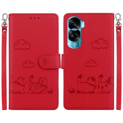Funda de Cuero Rfid para Honor 90 Lite con Diseño de Gatos (Roja)