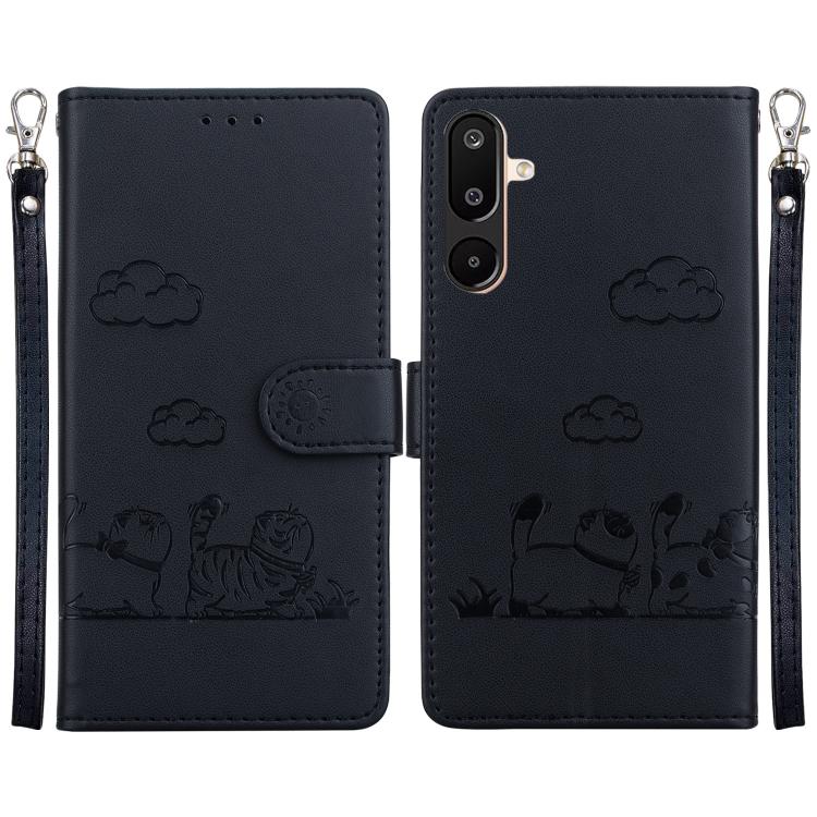 Funda de cuero RFID con diseño de gatos para Samsung Galaxy M16 5G / F16 5G / M36 5G (negra)