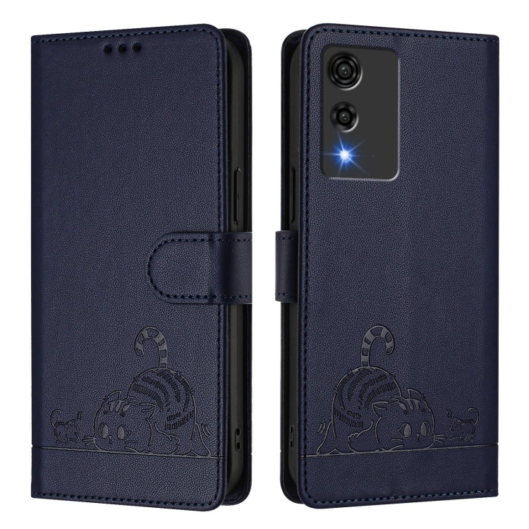Funda de Cuero Rfid para Cubot A10 con Estampado de Rata y Gato en Relieve y Cordón (Azul)