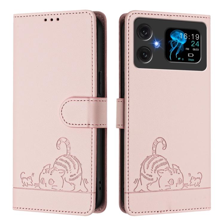 Funda de Cuero Rfid Cubot A20 con Cordón Estampado Rata y Gato en Relieve (Rosa)