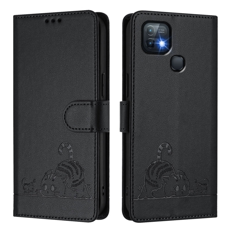 Funda de Cuero Rfid para Infinix Hot 10I con Estampado de Rata y Gato en Relieve y Cordón (Negro)