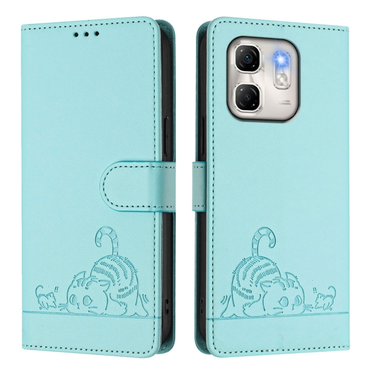 Funda de Cuero Rfid para Infinix Hot 50I 5G y Smart 9 4G con Estampado de Rata y Gato en Relieve y Cordón (Verde Menta)