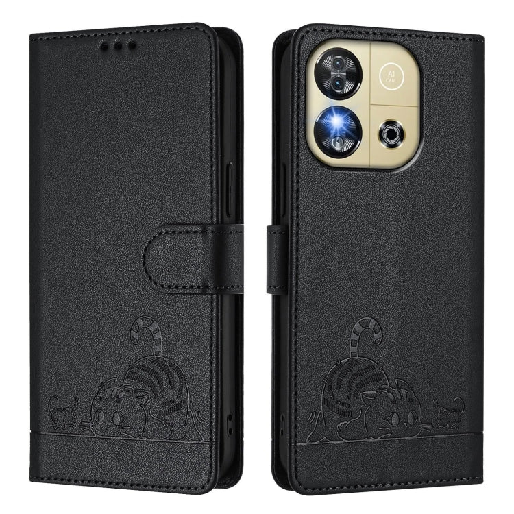 Funda de Cuero Rfid para Oukitel C57S con Estampado de Rata y Gato en Relieve y Cordón (Negro)