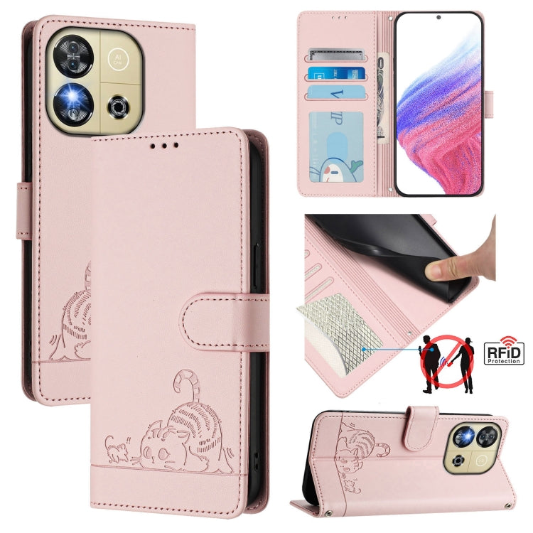 Funda de Cuero Rfid para Oukitel C57S con Estampado de Rata y Gato en Relieve y Cordón (Rosa)