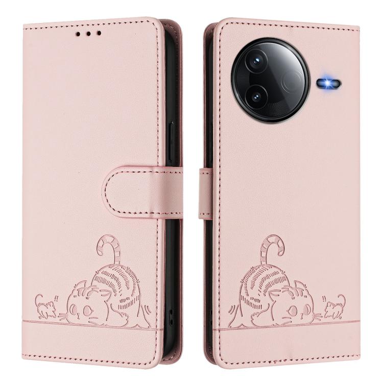 Funda de Cuero Rfid con Estampado de Rata y Gato En Relieve para Redmi K80 5G/K80 Pro 5G con Cordón (Rosa)