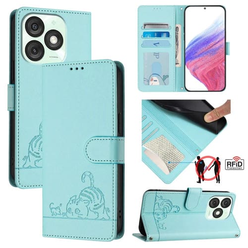Funda de Cuero Rfid para Teléfono Itel A50 con Estampado de Rata y Gato y Cordón (Verde Menta)