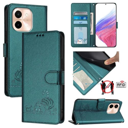 Funda de Cuero Rfid con Estampado de Rata y Gato para Vivo Y28 4G con Cordón (Verde Pavo Real)