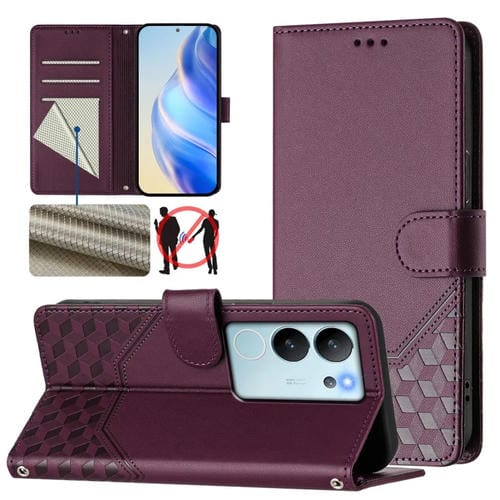 Funda de Cuero Rfid con Relieve de Panal Global para Vivo V29E 5G / Y200 5G (Violeta)