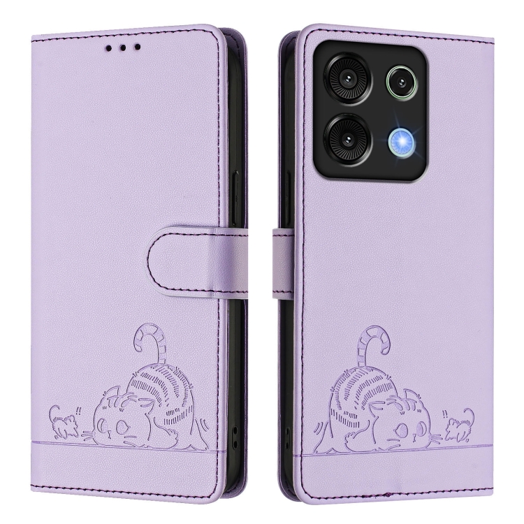Funda de Cuero Rfid para Umidigi G9 5G con Relieve de Rata y Gato y Cordón (Morado)