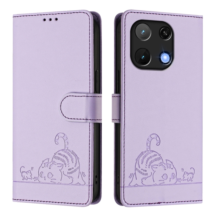 Funda de Cuero Rfid para Umidigi Note 90 con Relieve de Rata y Gato y Cordón (Morado)