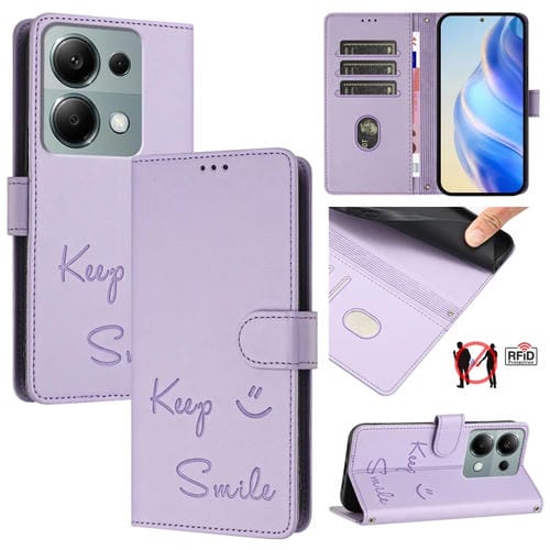 Funda de Cuero Rfid con Relieve de Sonrisa Global para Redmi Note 13 Pro 4G (Morado Claro)