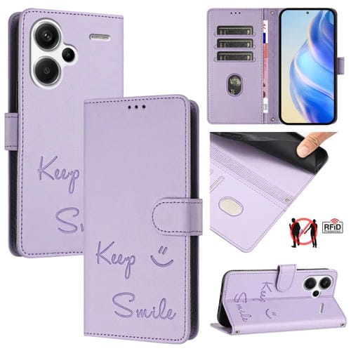 Funda de Cuero Rfid con Relieve de Sonrisa Global para Redmi Note 13 Pro+ (Morado Claro)
