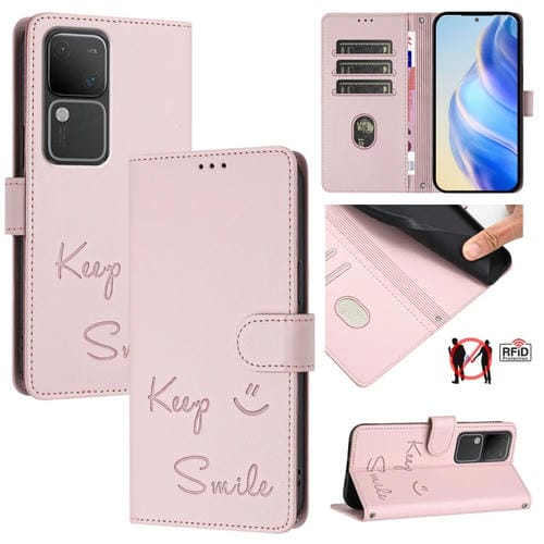 Funda de Cuero Rfid con Relieve de Sonrisa Global para Vivo V30 5G (Rosa)