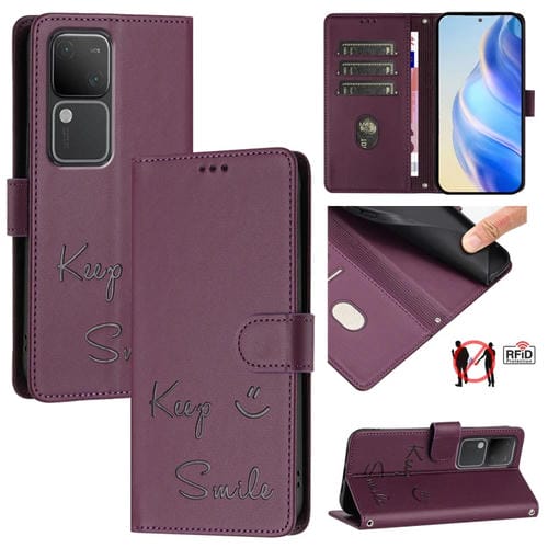 Funda de Cuero Rfid con Relieve de Sonrisa Global para Vivo V30 5G (Violeta)
