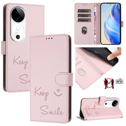 Funda de Cuero Rfid con Relieve de Sonrisa para Teléfono Vivo S19 (Rosa)