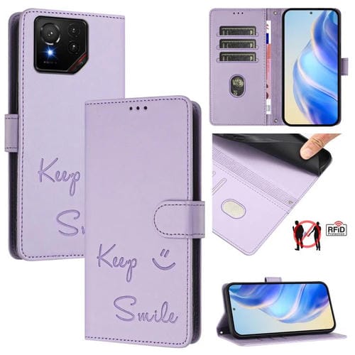 Funda de Cuero Rfid con Relieve Sonriente para Asus Rog Phone 9 y 9 Pro (Morado Claro)