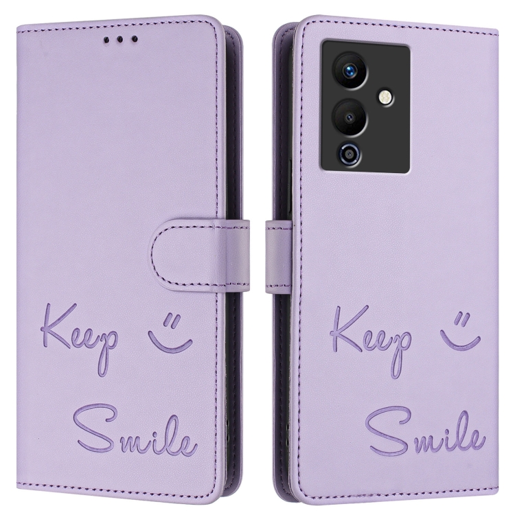 Funda de Cuero RFID con Relieve Sonriente para Infinix Note 12 Pro 5G y Note 12 5G (Morado Claro)