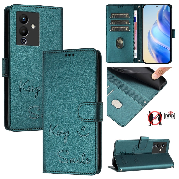Funda de Cuero Rfid con Relieve Sonriente para Infinix Note 12 Pro 5G y Note 12 5G (Verde Pavo Real)