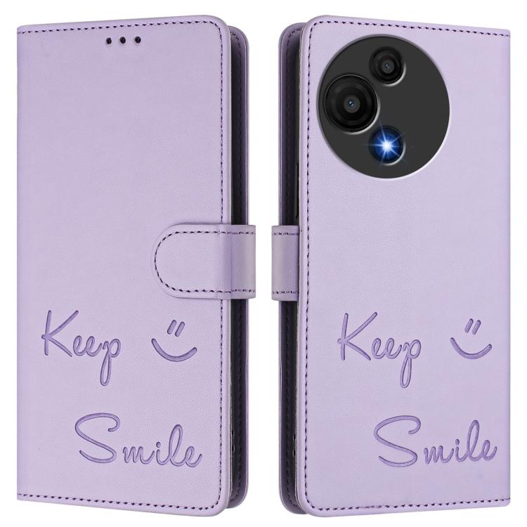 Funda de cuero RFID con relieve sonriente para TCL 605/60 SE (morado claro)