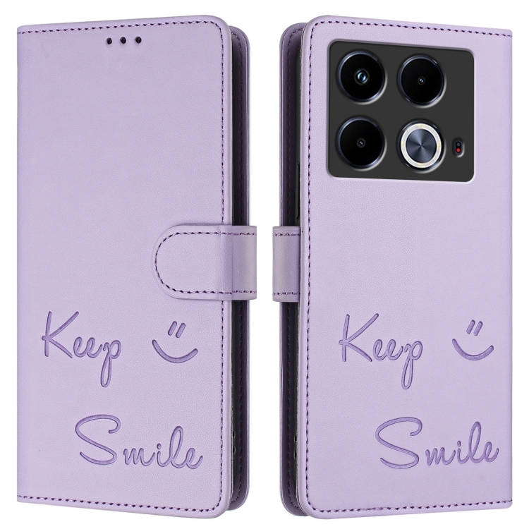 Funda de Cuero RFID con Relieve Sonriente para Teléfono Infinix Note 40 4G (Morado Claro)