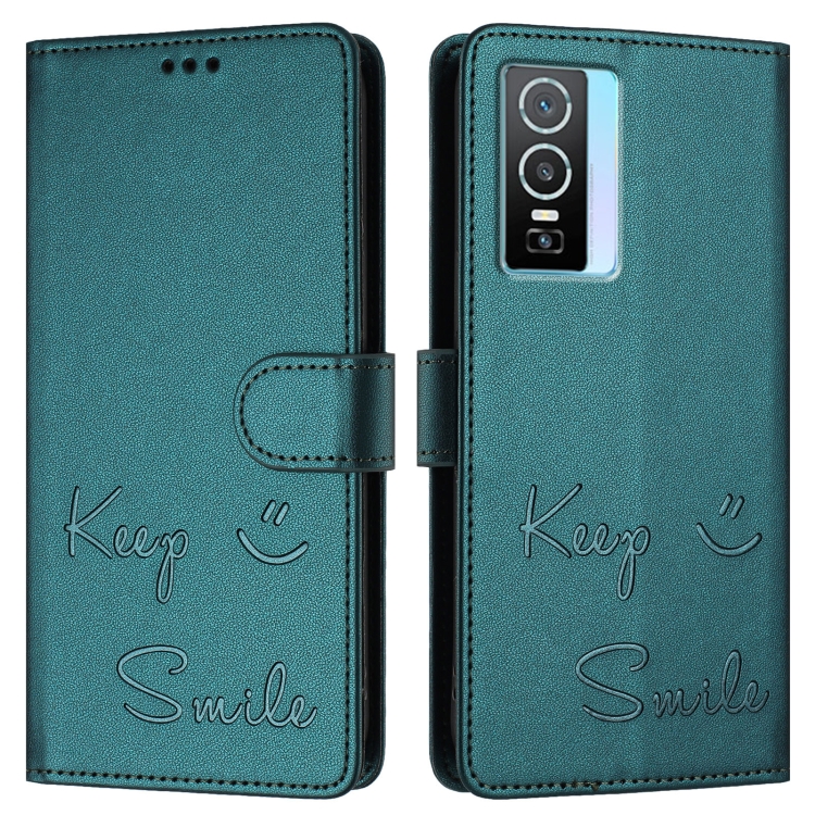 Funda de Cuero Rfid con Relieve Sonriente para Vivo Y76 5G (Verde Pavo Real)