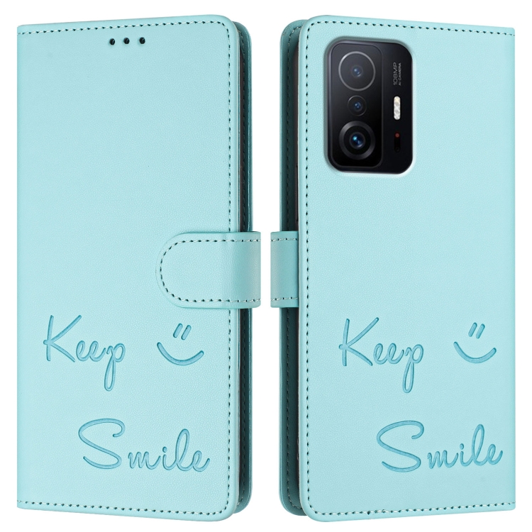 Funda de Cuero Rfid con Relieve Sonriente para Xiaomi 11T/11T Pro (Verde Menta)