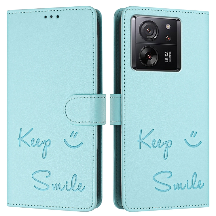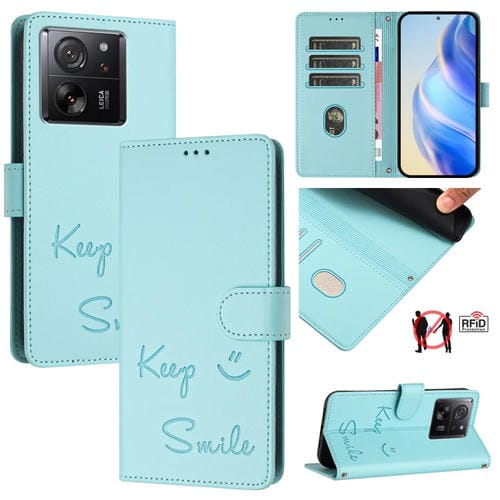 Funda de Cuero Rfid con Relieve Sonriente para Xiaomi 13T/13T Pro (Verde Menta)