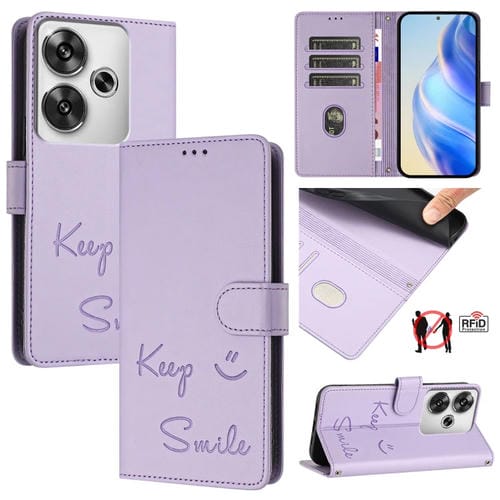 Funda de Cuero Rfid con Relieve Sonriente para Xiaomi Poco F6 5G (Morado Claro)