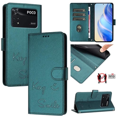 Funda de Cuero Rfid con Relieve Sonriente para Xiaomi Poco M4 Pro 4G (Verde Pavo Real)