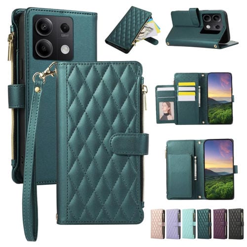 Funda de Cuero Tipo Billetera con Cremallera Rombal para Redmi Note 13 5G (Verde)