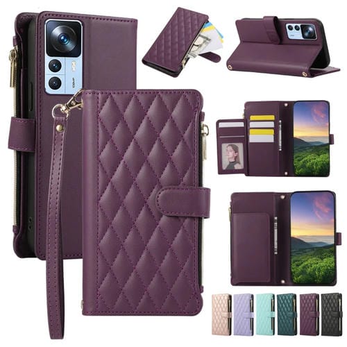 Funda de Cuero Tipo Billetera con Cremallera Rombal para Xiaomi 12T/12T Pro (Morado Oscuro)