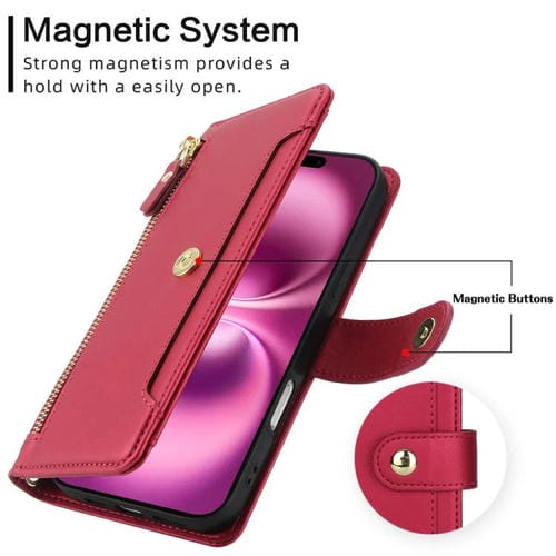 Funda de cuero tipo billetera con cremallera y siete ranuras para tarjetas para iPhone 17 (roja)