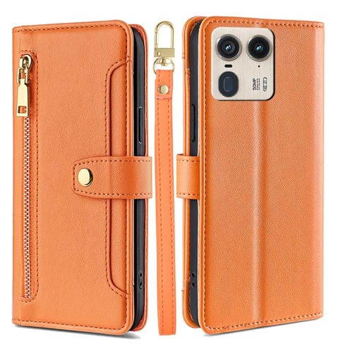 Funda de Cuero Tipo Billetera con Cremallera y Textura de Oveja para Motorola Edge 50 Ultra (Naranja)