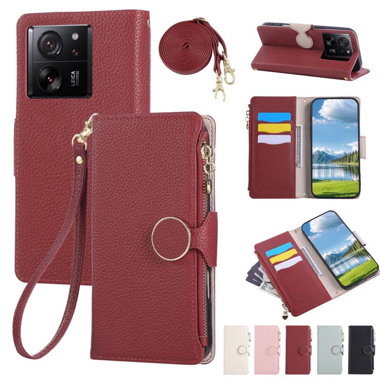 Funda de cuero tipo billetera con hebilla redonda y cremallera para Xiaomi 13T/13T Pro, con correa cruzada (roja)