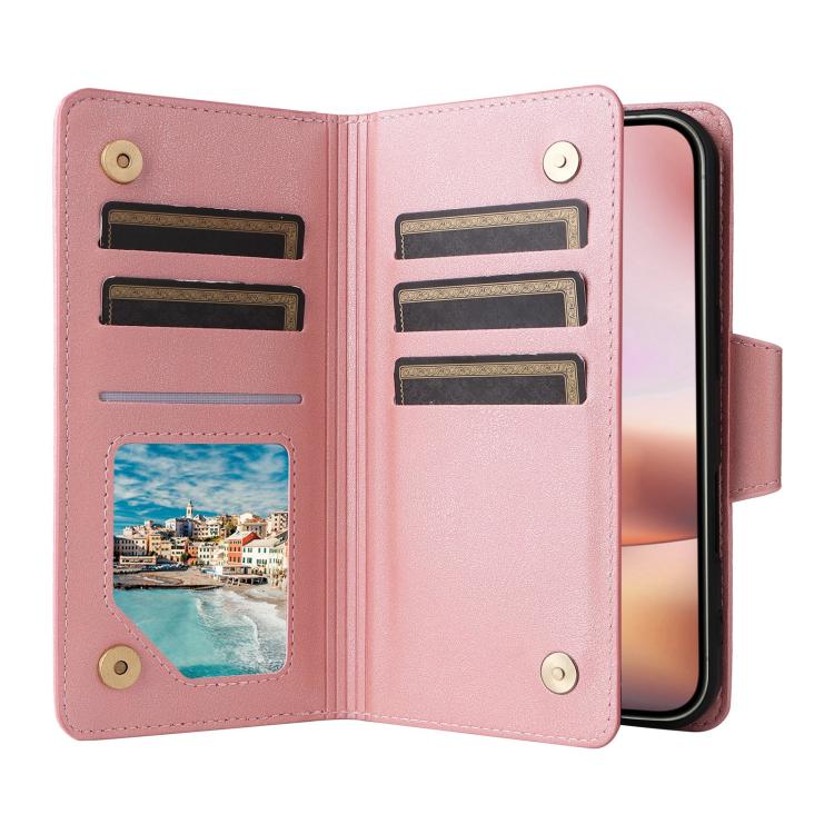Funda de cuero triple con hebilla de remache para iPhone 17, 9 tarjetas (oro rosa)