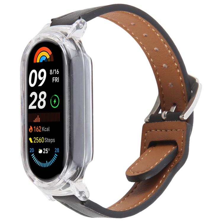 Funda de PC para Xiaomi Smart Band 9 con correa de cuero de microfibra integrada (transparente y negra)