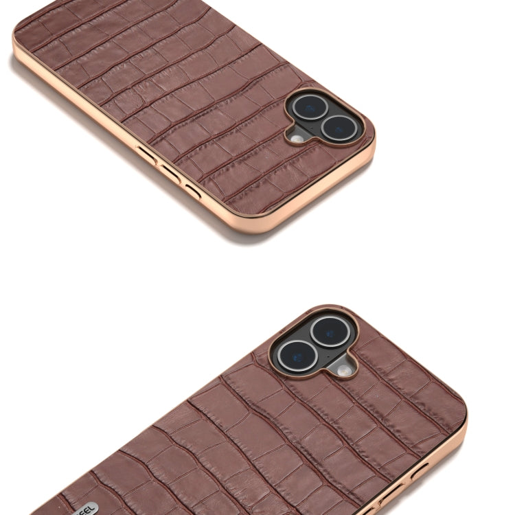 Funda de Piel Auténtica Abeel para iPhone 16 con Textura de Cocodrilo y Marco Galvanizado (Marrón)