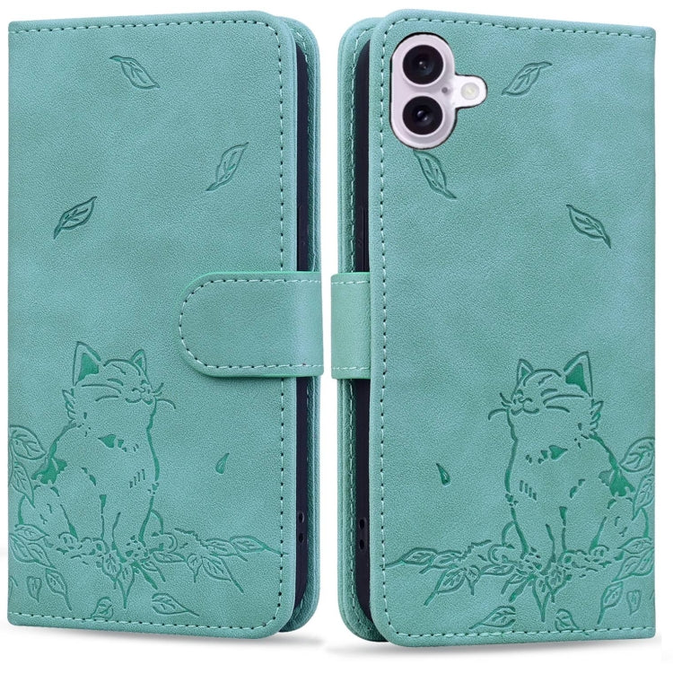 Funda de Piel para iPhone 16 Estampado de Gato (Verde)