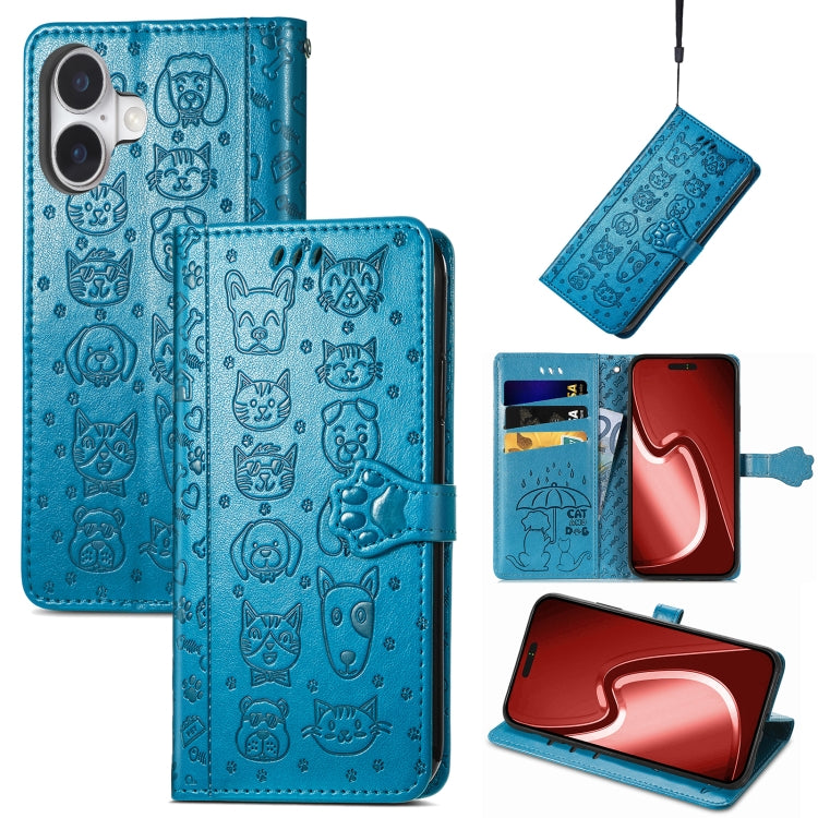 Funda de Piel para iPhone 16 con Relieve de Gato y Perro (Azul)