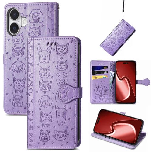 Funda de Piel con Relieve de Gato y Perro para iPhone 16 Plus (Morado)