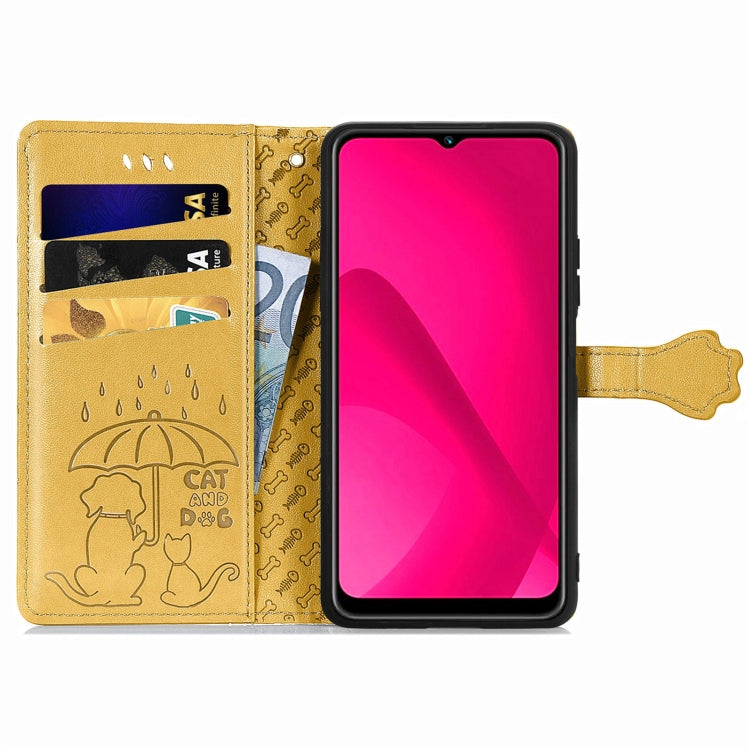 Funda de Piel con Relieve de Gato y Perro para Oukitel C53 (Amarilla)