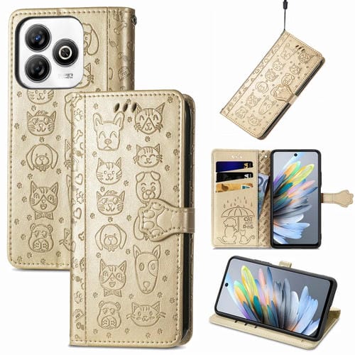 Funda de Piel con Relieve de Gato y Perro para ZTE Blade A75 4G (Dorada)