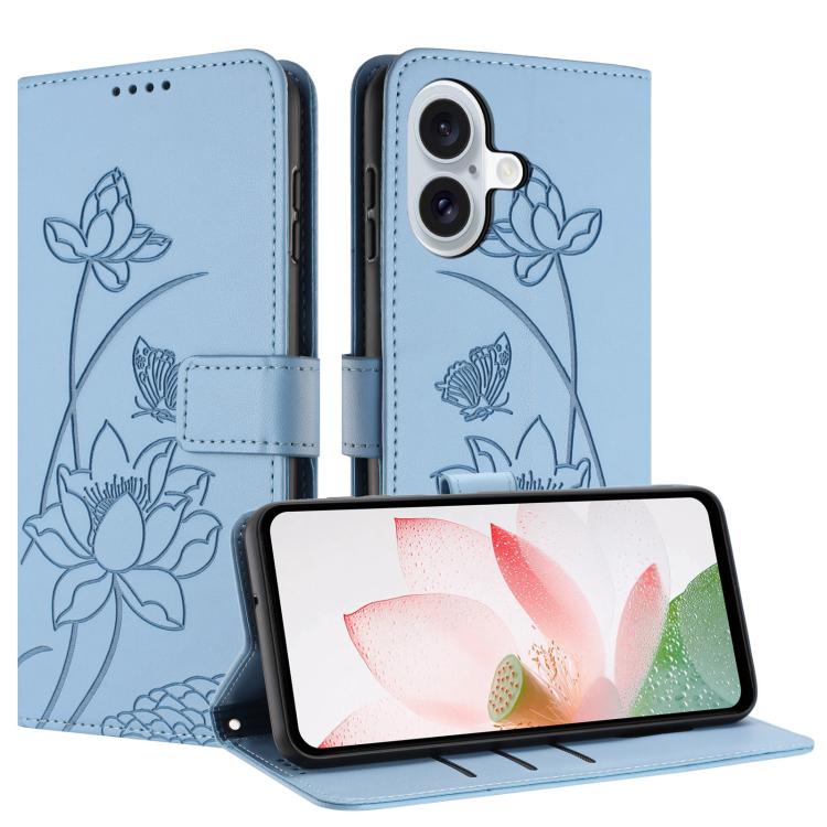 Funda de piel con relieve de loto para iPhone 17 con cordón (azul)