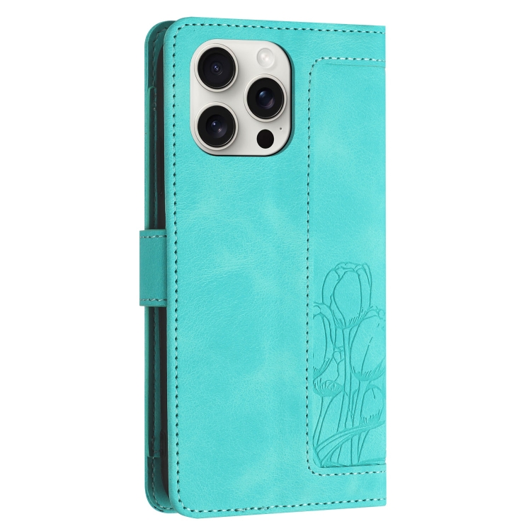 Funda de Piel con Relieve de Tulipanes para iPhone 15 Pro con Cordón (Verde)