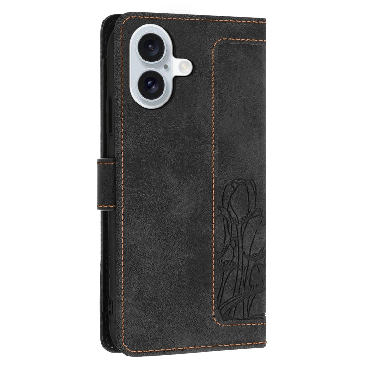Funda de piel con relieve de tulipanes para iPhone 16 con cordón (Negro)